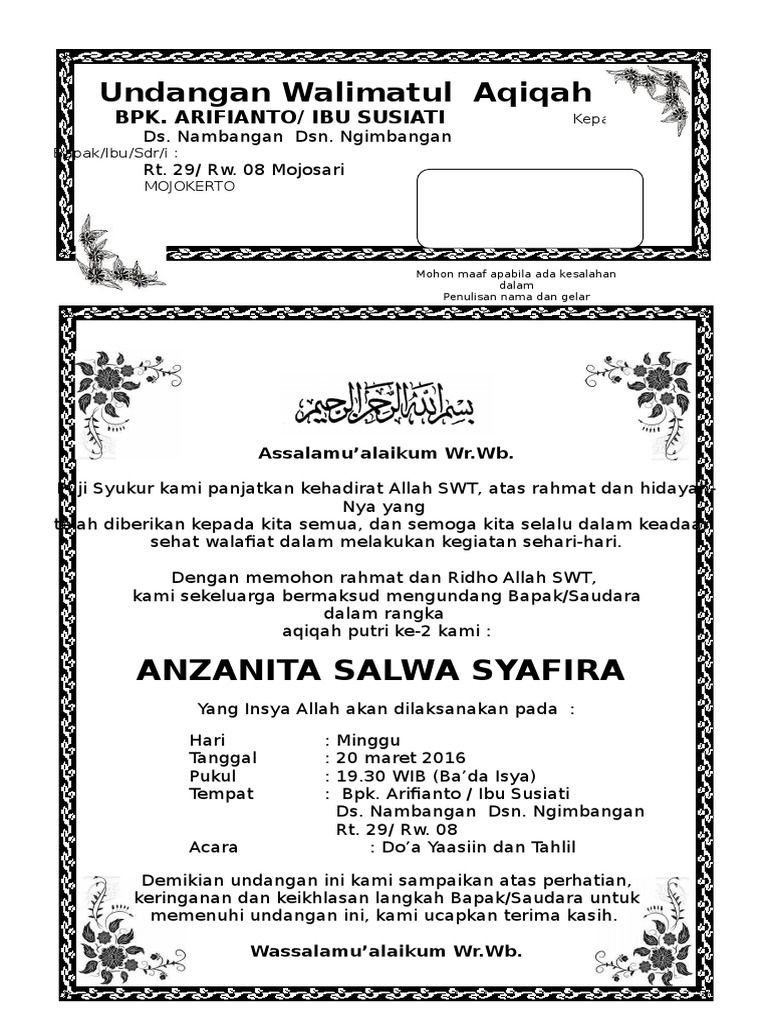 Contoh Surat Undangan Aqiqah Tasyakuran Kelahiran Bayi