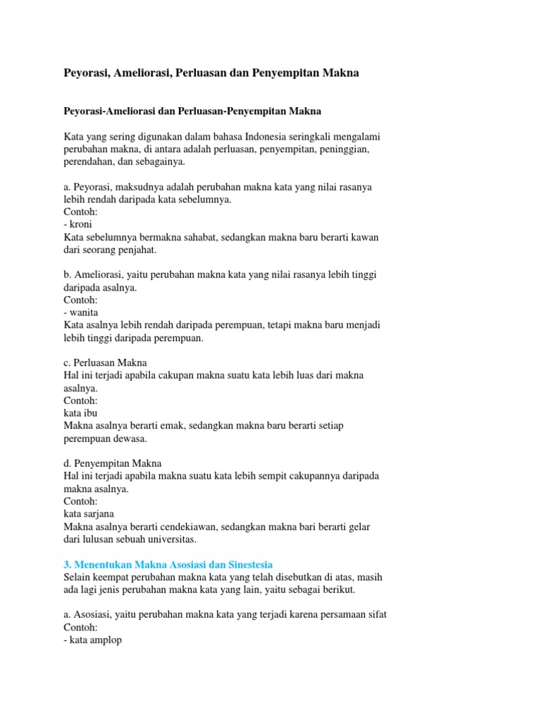 contoh perubahan makna ameliorasi, peyorasi dan sinestesia beserta kalimat - Brainly.co.id