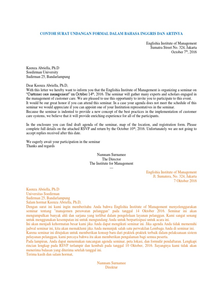 Surat Undangan Dalam Bahasa Inggris Dan Terjemahannya - Contoh Seputar Surat