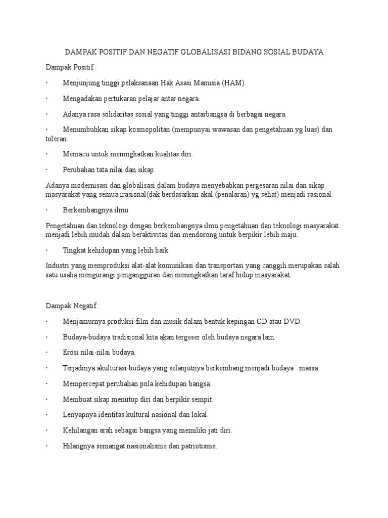 Dampak Positif Dan Negatif Globalisasi Bidang Sosial Budaya