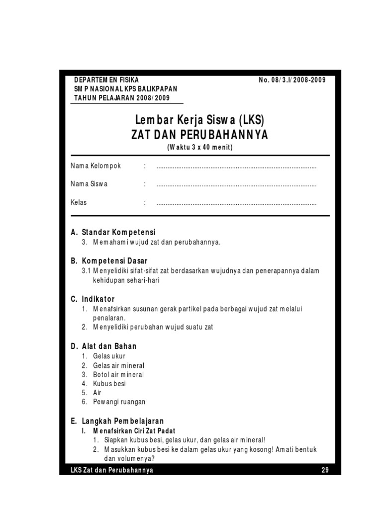 LEMBAR KERJA SISWA PENGARUH KALOR TERHADAP SUHU DAN WUJUD ZAT - PDF Free Download