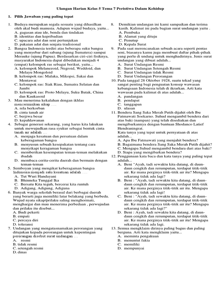 Soal Ulangan Kelas 5 Tema 7 Peristiwa Dalam Kehidupan