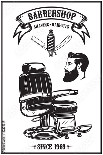 Barbershop poster with barber chair, haircut tools. Design elements for poster, emblem. Vector illustration - Buy this stock vector and explore similar vectors at Adobe Stock | Adobe Stock