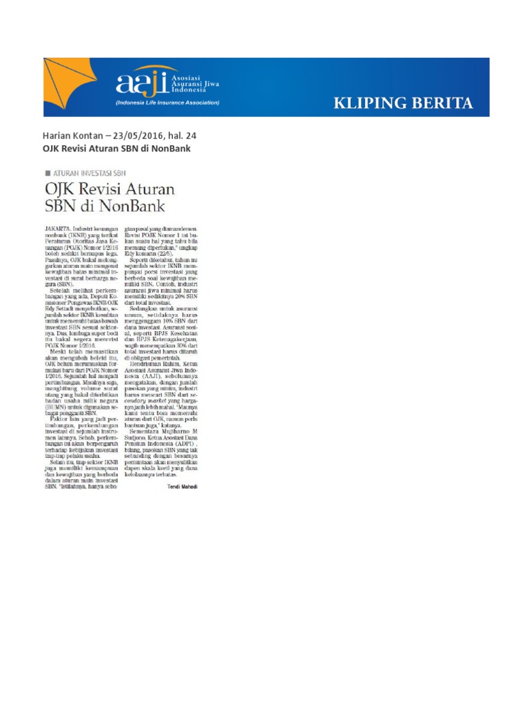 Harian Kontan – 23/05/2016, Hal. 24: Ojk Revisi Aturan Sbn Di …