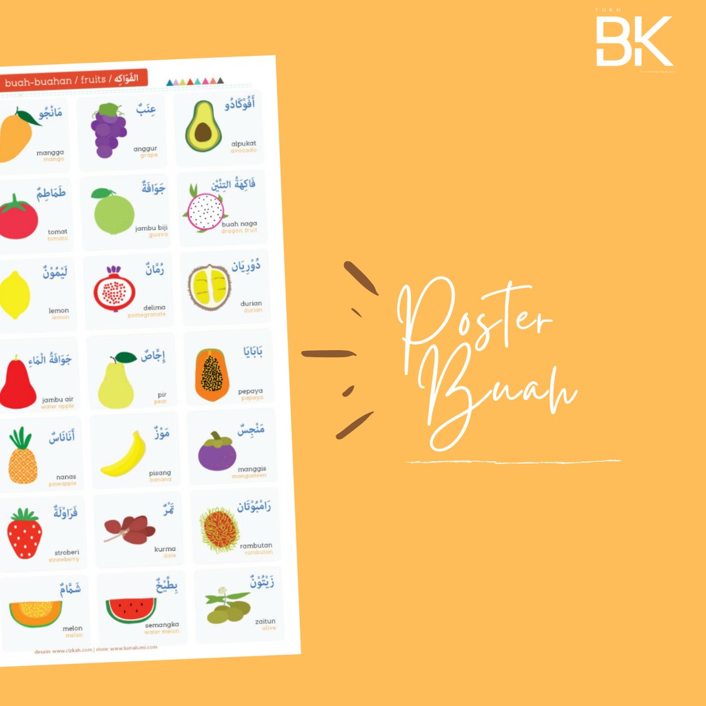 Poster Pendidikan Anak Muslim Buah-Buahan 3 Bahasa (Inggris, Arab dan Indonesia) | Shopee Indonesia