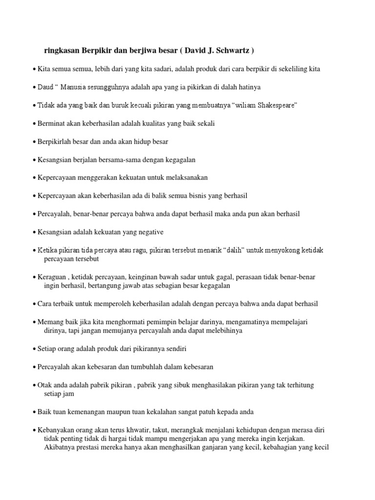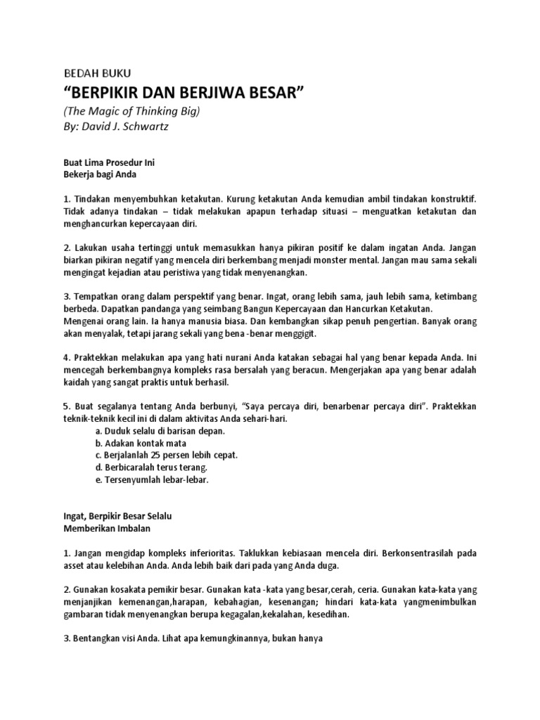 Ringkasan Buku Berpikir Dan Berjiwa Besar