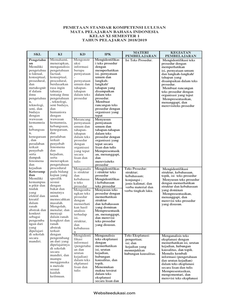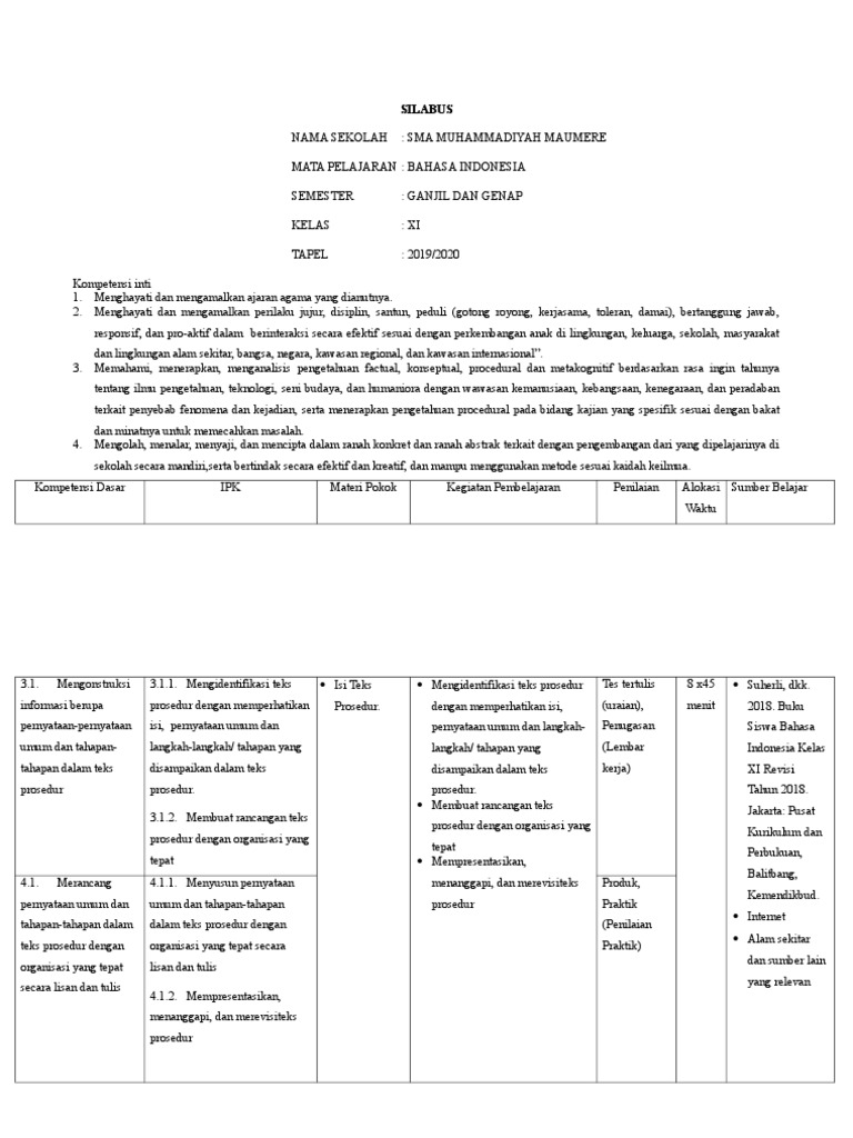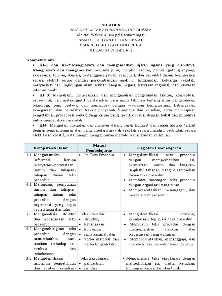 DOC) SILABUS MATA PELAJARAN BAHASA INDONESIA Alokasi Waktu: 4 jam pelajaran/minggu SEMESTER GANJIL DAN GENAP SMA PGRI 1 TULUNGAGUNG KELAS XI (SEBELAS | Misbakhul Ulumudin - Academia.edu