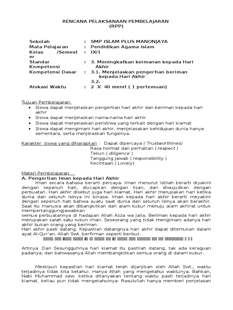 RPP IMAN KEPADA HARI AKHIR