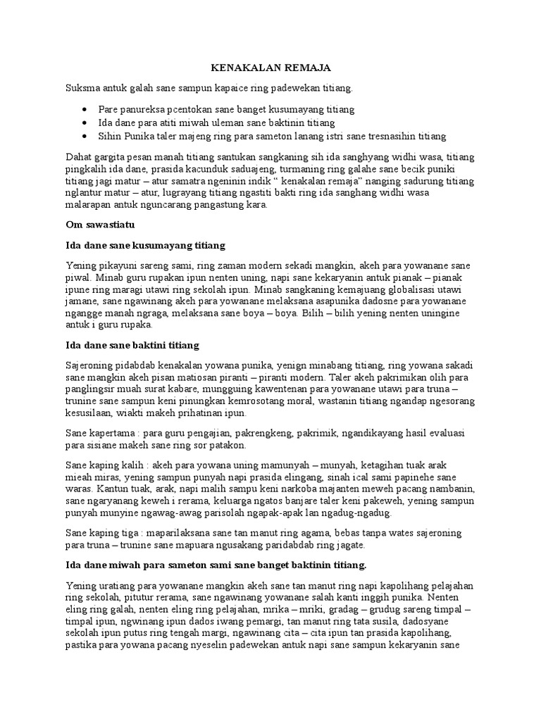 Tolong buatkan pidato bahasa bali tentang kenakalan remaja plis …